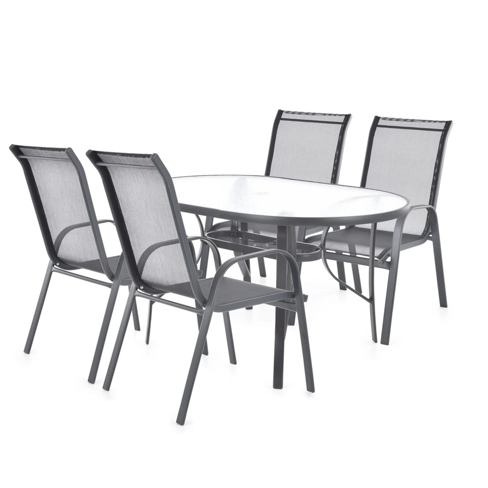 Un set combinat confortabil de patru scaune și o masă care va deveni un loc plăcut pentru a sta în grădină sau pe terasă. Mobilierul este realizat din profile de oțel-aluminiu cu un finisaj comaxit, iar masa este prevăzută cu un blat din sticlă călită. Datorită greutății sale ușoare, mobilierul este ușor de transportat, iar scaunele sunt stivuibile pentru a economisi spațiu de depozitare.