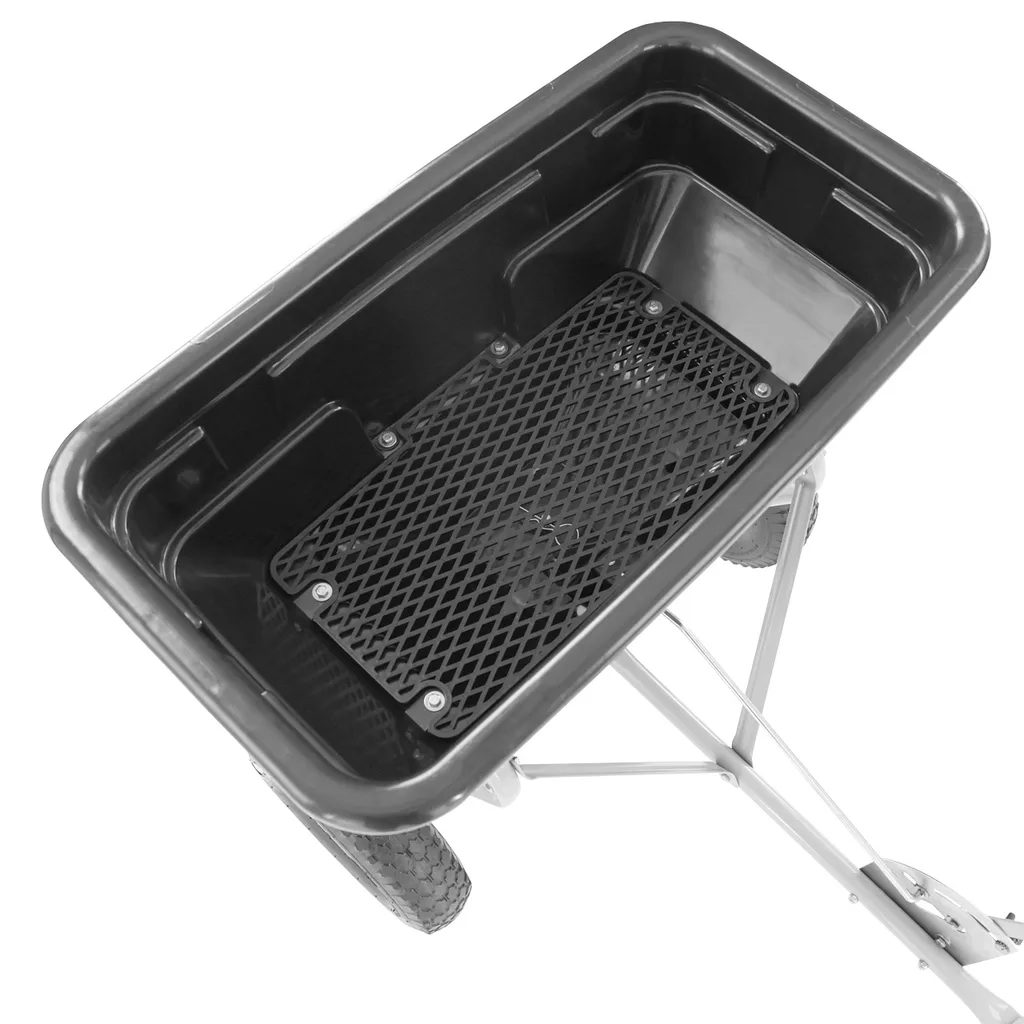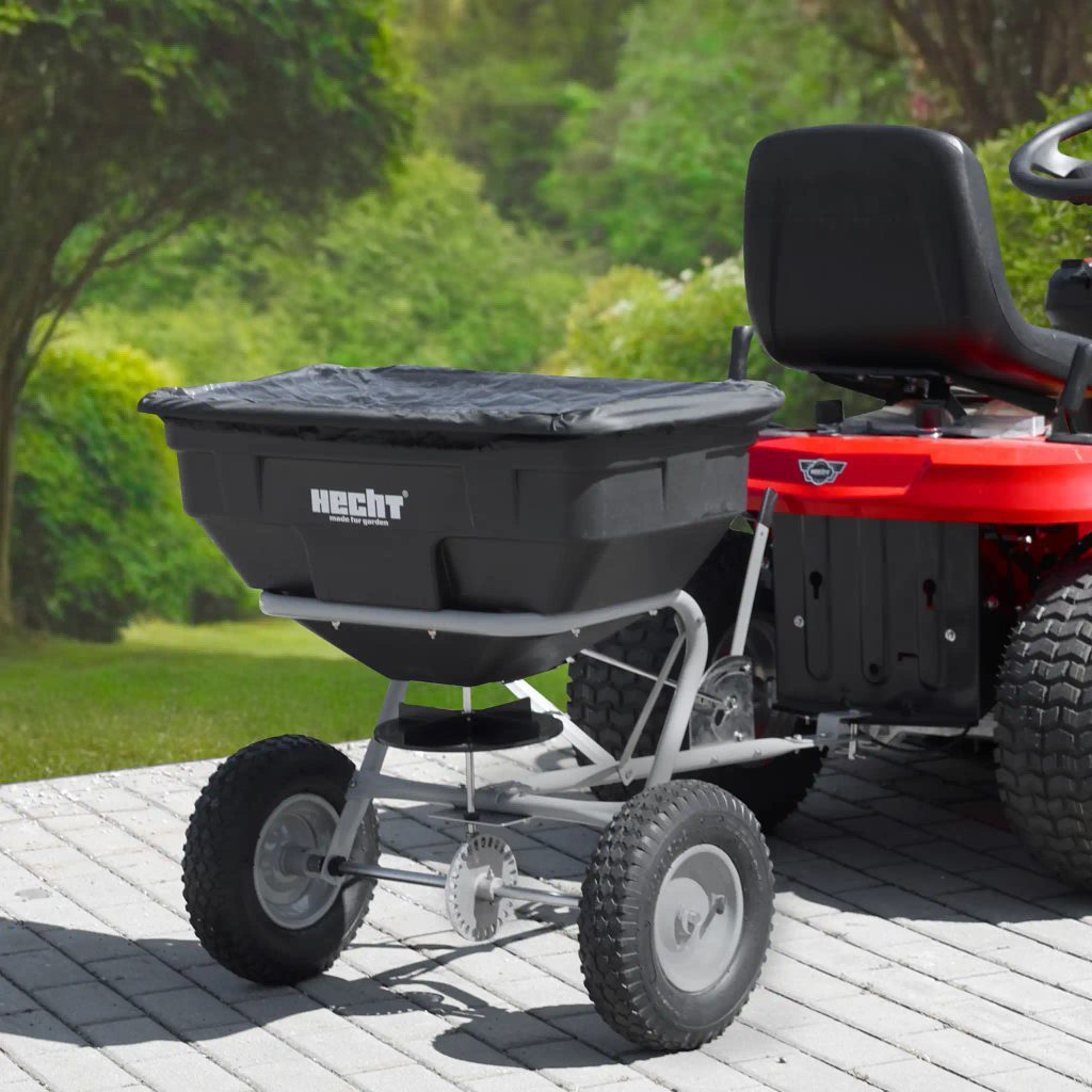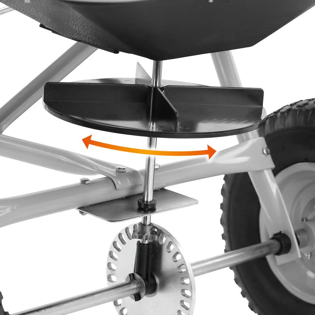 Distribuitorul de îngrășăminte, semințe și sare. Caruciorul este un adaos excelent pentru tractoarele de grădină și va deveni un mare ajutor în întreținerea regulată a suprafețelor mai mari. Sistemul este antrenat de o transmisie de la roțile de deplasare. Acest lucru asigură o acoperire relativ uniformă a suprafeței - volumul materialului răspândit este direct proporțional cu distanța parcursă. O pârghie cu opritor reglabil pe bara de remorcare este utilizată pentru a controla intensitatea împrăștierii. Pârghia este ușor accesibilă de pe scaunul șoferului la majoritatea tractoarelor de grădină, permițând întreruperea în voie a aplicării distribuitorului. Opritorul pârghiei este apoi folosit pentru a regla intensitatea împrăștierii. Căruciorul poate ține până la 60 l de semințe, îngrășământ sau sare și este echipat cu o sită care împiedică înfundarea mecanismului de împrăștiere. Este inclusă și o folie pentru acoperire.