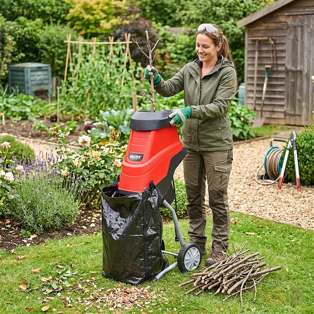 Tocător electric de crengi performant, cu motor de 2800 W, sistem de tăiere cu lame și sac de colectare mare Întreaga descriere ▼